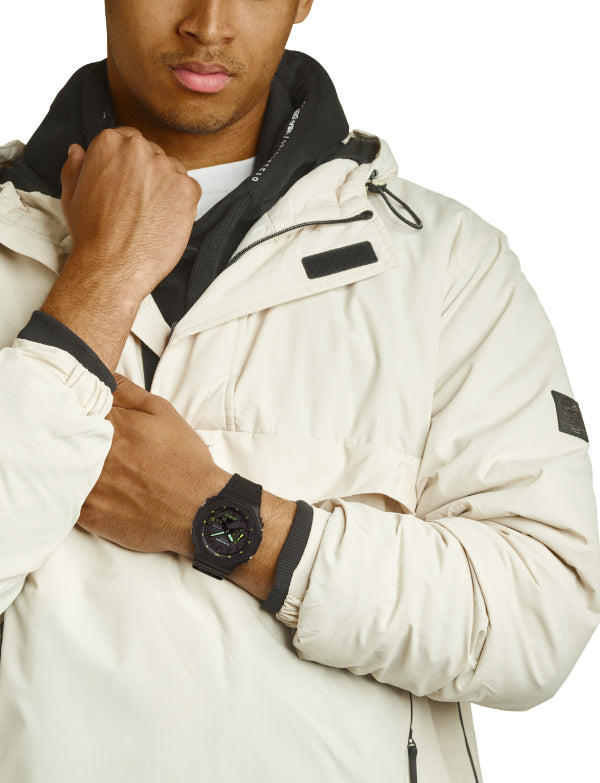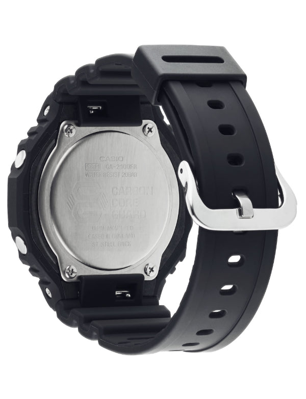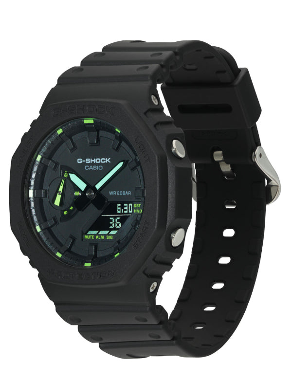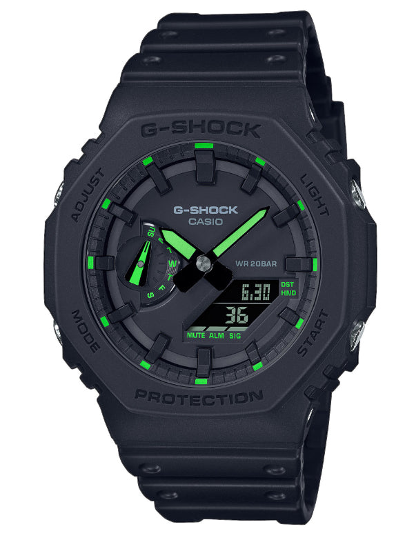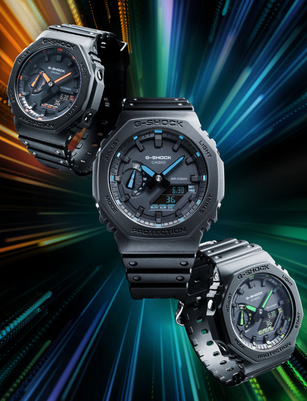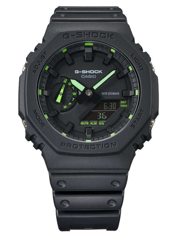 The G-SHOCK GA-2100 Utility Black Series is a new twist on the original iconic stealth model GA-2100-1A1 model, born by adding fluorescent highlights. These watches retain the simplified bezel lettering and black dial of the original, and the GA-2100-1A4ER has neon green details on the hands, hour marker tips, day indicator, and dial labels. The lightweight GA-2100 is still the slimmest G-SHOCK men’s model, and features a a Carbon Core Guard structure with an interior case made of carbon fiber-reinforced resin. Other features include world time, stopwatch, countdown timer, 5 alarms, and double LED light with LCD backlight.
