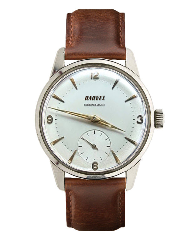 Classic dress watch, stylish and elegant. It has an antique white satin dial with raised gold numerals, printed minute railway track, and a subsidiary seconds dial located above 6 o’clock. Its luminous diamond shaped hands are prominent and clearly visible under the domed crystal. Fitted with a luxury leather strap and brushed steel buckle. This timepiece is water resistant to 50 metres.
