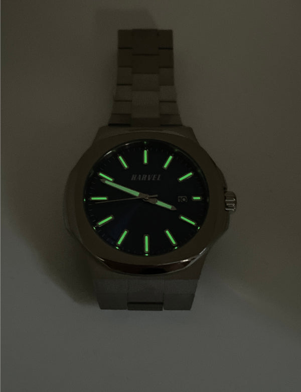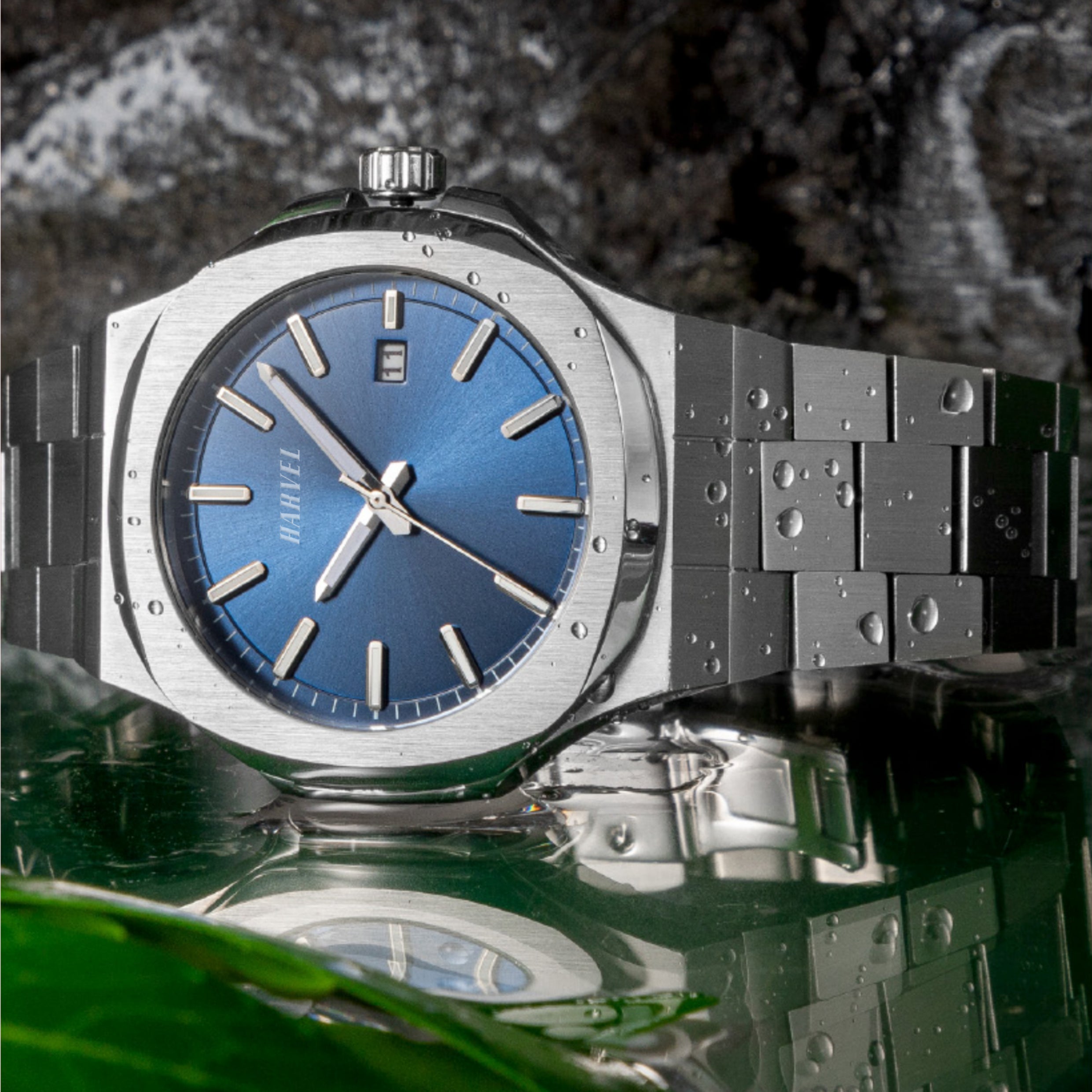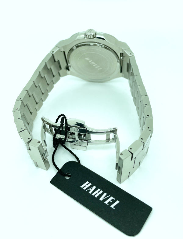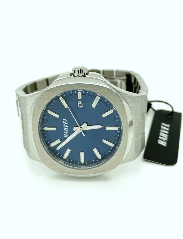 The HARVEL Planeta is in deep blue. The case styling makes this watch unique, presented in stainless steel with both water-resistant functionality and large dimensions.