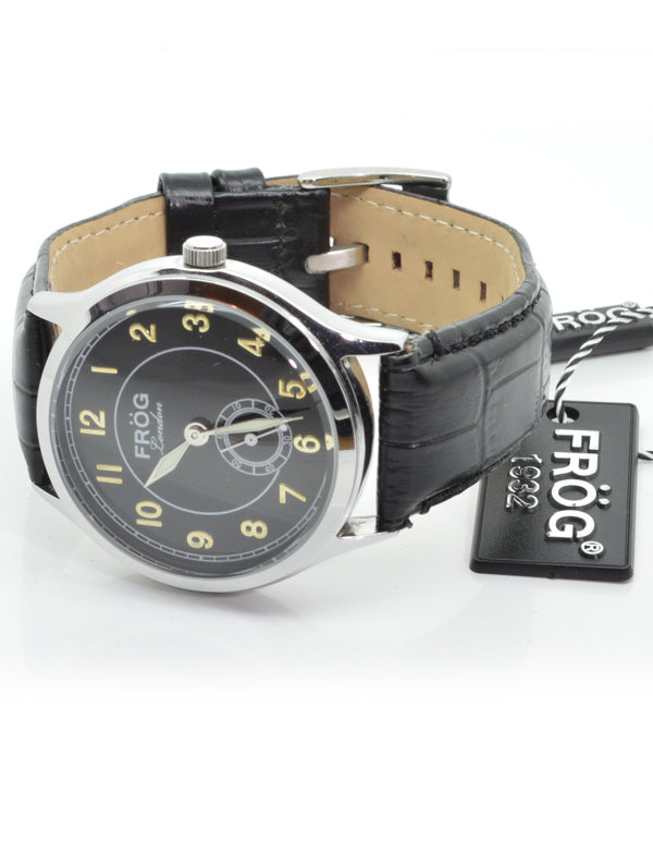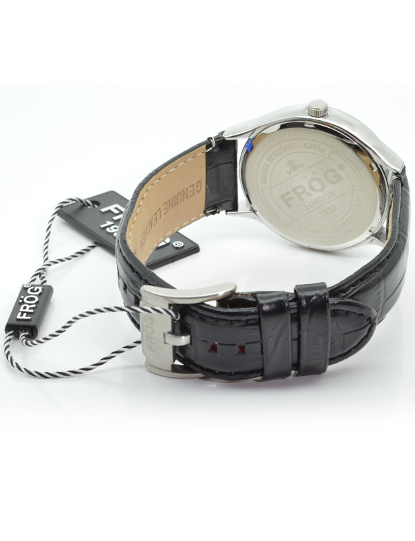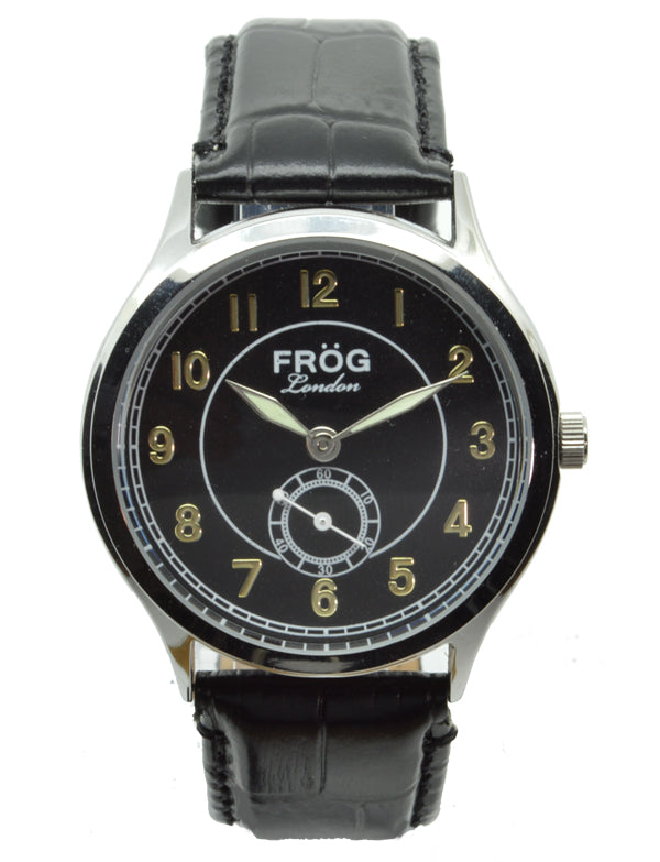 The COSMOS is the ultimate in gentleman’s vintage elegance. It has a black satin dial with raised gold numerals, printed white minute railway track, and a subsidiary seconds dial located above 6 o’clock. Its luminous diamond shaped hands are prominent and clearly visible under the domed crystal. Fitted with a luxury leather strap and brushed steel buckle. This timepiece is water resistant to 50 metres.